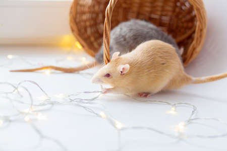 The mouse sits in the New Year's circle. Festive animals close up. Rat on a Christmas background.