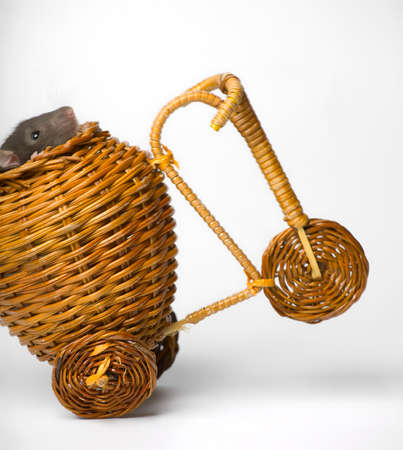 Gray funny rat Dumbo in a shopping cart on a white background. She has black eyes and large ears. The concept of pets, for pet stores, pet supplies.