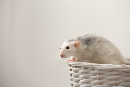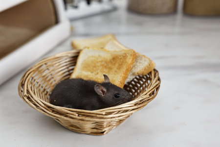 Gray rat and toasts in wicker basket on white marble table, space for text.