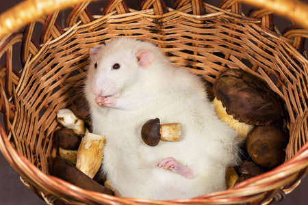 Pets at home.Cute white rat of dumbo species in a basket with forest mushrooms.
