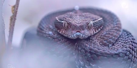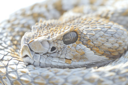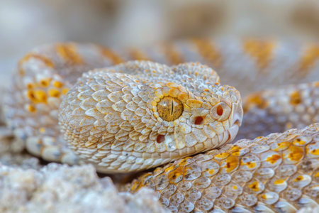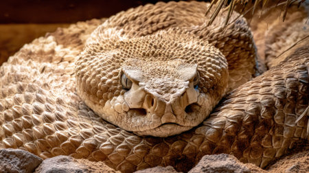 Desert Horned Viper characterized by its distinct horns above the eyes is coiled gracefully. Soft lighting highlights the intricate patterns on its scales showcasing natures artistry.