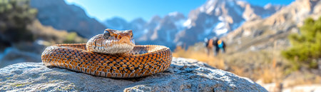 Snake coiled on rock, hikers blurred in background, sunny mountain trail