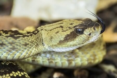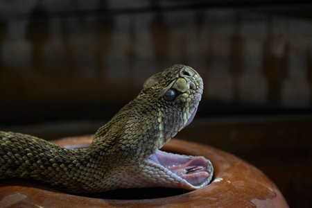 Beautiful close-up portrait of the head of a rattlesnake with its mouth open in the natural park of Cabarceno, in Cantabria, Spain, Europe