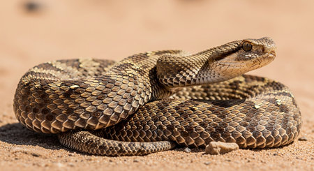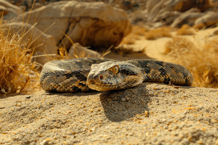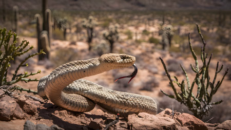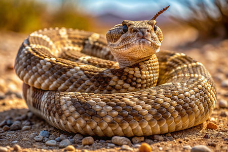 Desert Rattlesnake coiled, alert, sunny landscape