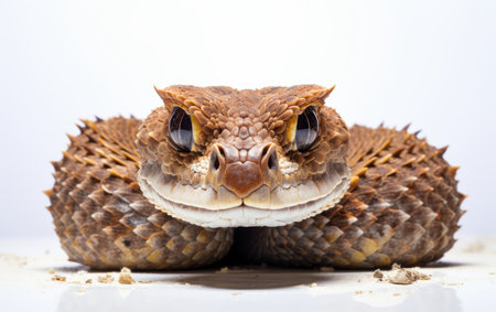 stunning reptile rests in a coiled position displaying its distinctive horns and intricate scale patterns illuminated by soft lighting to highlight its natural beauty.