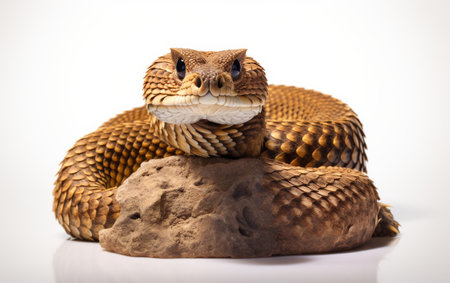 A striking Copperhead Snake is coiled and isolated against a white backdrop highlighting its unique copper colored scales with dramatic side lighting for enhanced detail.
