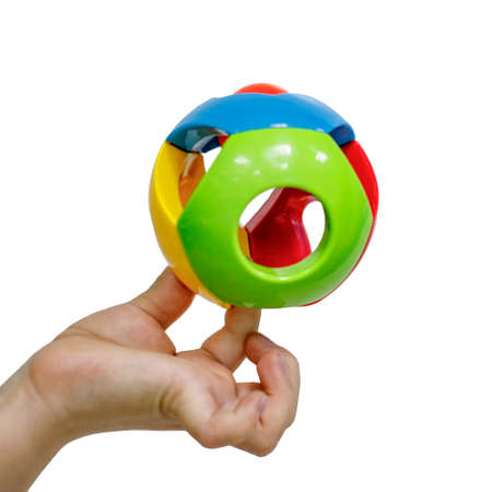 multi-colored ball toy rattle for baby isolated in baby's hand