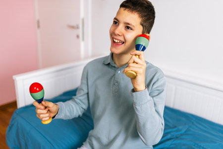 A young boy plays the tambourine with energy and enthusiasm while sitting on his bed, bringing rhythm and life to his cozy room.