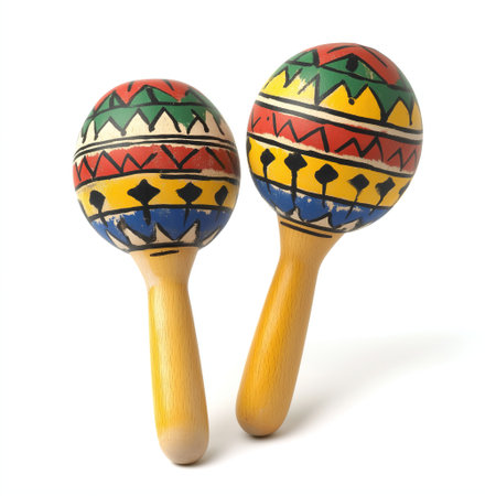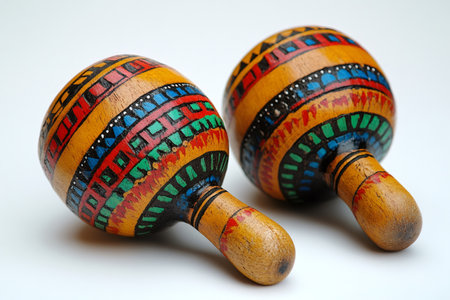 A pair of traditional wooden maracas with colorful hand-painted patterns, isolated on a white background