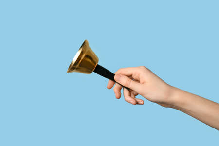 Female hand with golden Christmas bell on blue background, closeup