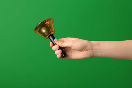Female hand with golden Christmas bell on green background, closeup