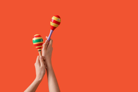 Female hands holding maracas on orange background