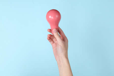 Hands holding pink lght bulb on blue background. Idea, inspiration concept