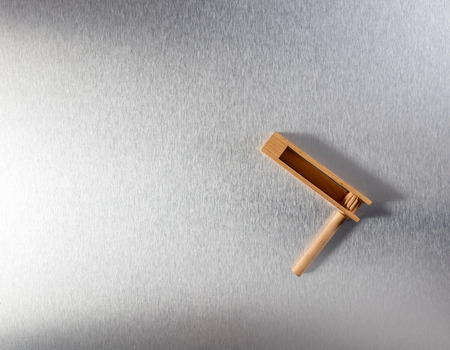 wooden noisemaker or rattle on stainless steel background for concept of waking up business, religious symbol or celebrating a holiday or festival, still life