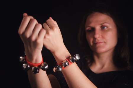 Woman dancer with jingle bells on her wrist. Traditional folk dance and festive celebration. Music and cultural performance concept.