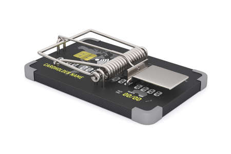 Credit Risk and Loan Trap - White Blank Credit Card Template in Wooden Mouse Trap on Black Background