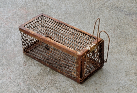Empty old steel cage for mousetrap placed on green grass. The rat trap is stil