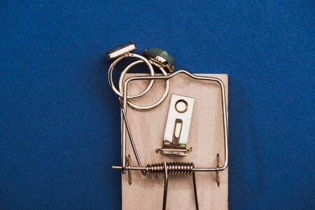 Top view of jewellery rings with gemstones in mouse trap on blue surface
