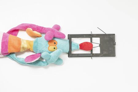 Creative concept. Artwork decoration of mousetrap in sand on dark toned foggy background. Mousetrap captured a man. Selective focus
