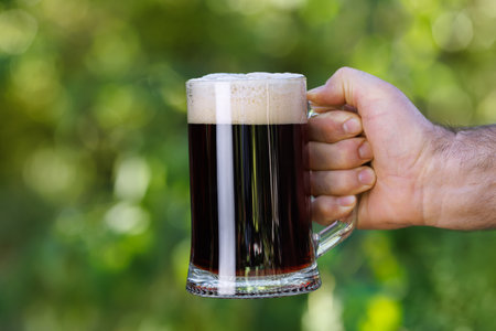 closeup male hand holding mug of dark beer with foam and making toast on green natural background