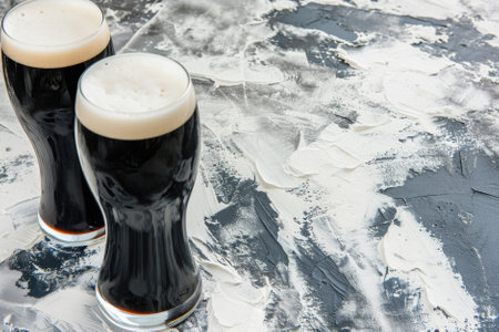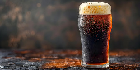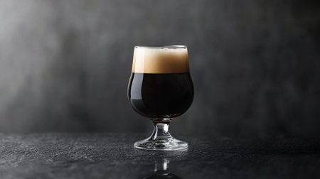 A captivating image of a dark beer served in an elegant glass, featuring a frothy foam top against a textured dark background, ideal for beverage promotions.