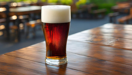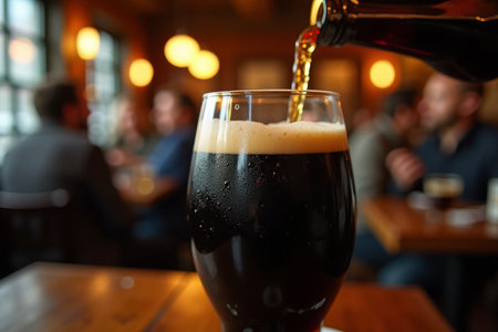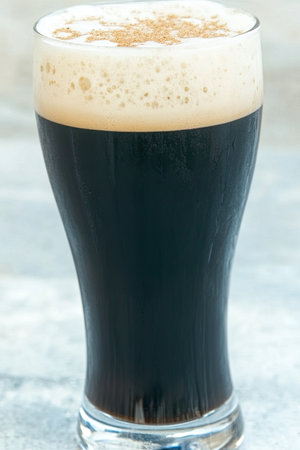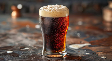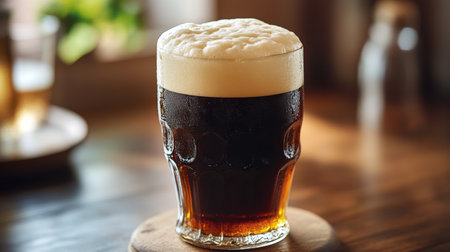 a tall glass of frothy dark bear under natural light, created with generative ai