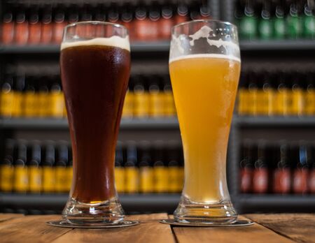 Close-up of two beer glasses on a wood table. Barley and wheat beers, yellow and red colors in a ambient of any brewery