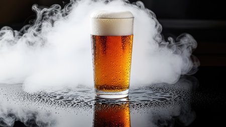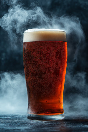 Frothy Amber Craft Beer in a Glass with Condensation, Set Against a Dark Moody Background