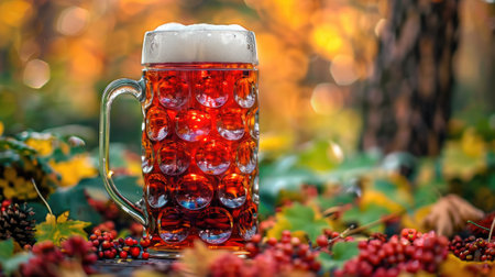 A tall glass of craft beer with a rich amber hue, sitting on a rustic wooden table, illuminated by soft, warm light that enhances the beers glow.