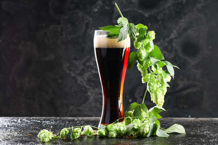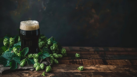 Fresh green hop cones and dark beer on dark oak table surrounded by lush green leaves
