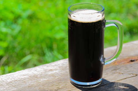 A cold glass of dark beer sits invitingly under the bright sun, perfect for a summer afternoon refreshment.