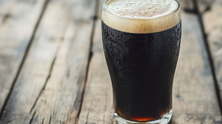 A close-up view of dark beer in a glass resting on a rustic wooden table, showcasing the rich color and frothy foam, perfect for beverage enthusiasts.