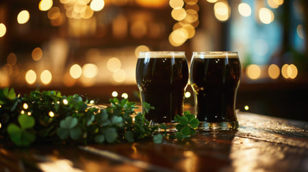 Realistic dark beer sets the tone for a cozy highly detailed restaurant scene with warm lighting and a neutral color palette. Nobody is in sight. Generative AI Generated