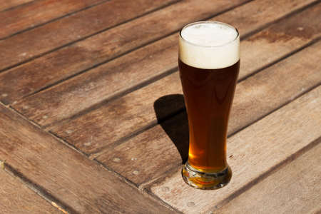 Glass pint of cold draft light lager or dark ale brewed beer with foam on table background. Brewery or pub bar advertising. Oktoberfest festival alcohol beverage or Saint Patricks day drink concept.