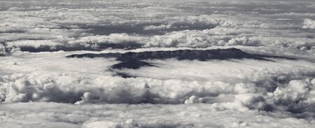 Panoramic aerial view on clouds and mountains in sun day. Black and white toned landscape.