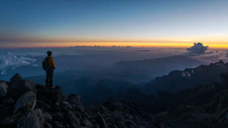 Solo traveler reaching the summit at dawn, embracing the serene beauty of a panoramic mountain view.