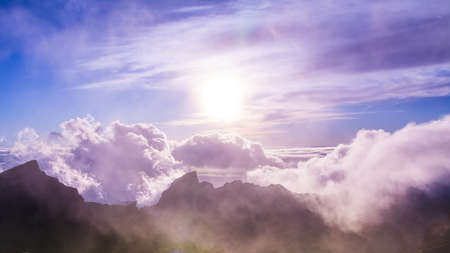 Amazing view of mountain peaks with beautiful clouds on the sunset. Location: Tenerife, Canary Islands, Spain. Artistic picture. Beauty world.