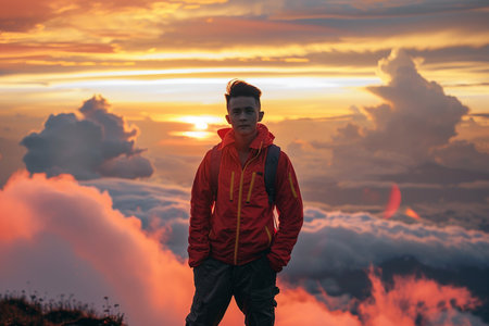 Generative AI Image of Photo of Asian Male Climber with Clouds Sky View at Sunset