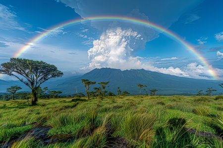 Beautiful rainbow over the volcano in etemenim, kep akfire of minduiltpeopel. in green grass and trees on a background of blue sky with clouds, against the backdrop is one mountain. a beautiful landscape,