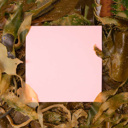 Fresh natural Atlantic seaweed flat lay arrangement with pink square creative copy space.