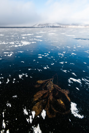 Underwater plants frozen under the ice of the lake. Transparent ice with snow close up. Selective focus. Beautiful winter landscape