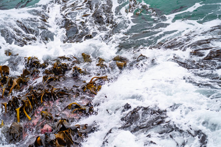 bull kelp seaweed growing on a rocky coastline by the ocean in australia