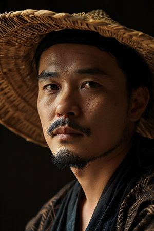 Portrait of a handsome asian man wearing a hat and looking at camera