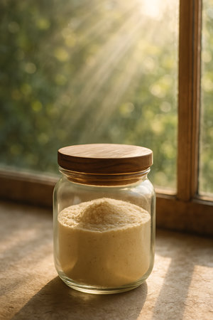 A jar filled with a yellowish substance sits on a table in the sunlight near a window.