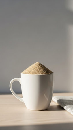 Semolina grains are suspended air soft bright background illustrating their fine texture and form as they separate and settle.