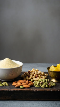 A serene composition featuring a bowl of yellow flour beside a beautifully wrapped package, set against an aged cloth backdrop. Perfect for culinary themes.