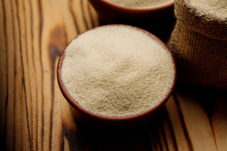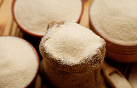 Semolina in bowls and bags on a wooden background. High quality photo