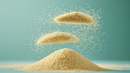 Semolina grains are suspended mid air creating striking visual their texture and individual particles. dark background enhances levitation effect drawing attention.