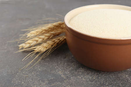 Semolina in bowl and spikelets on gray table, closeup
