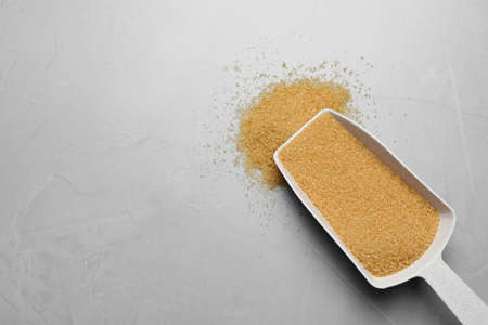 Brown sugar and scoop on light gray table, flat lay. Space for text